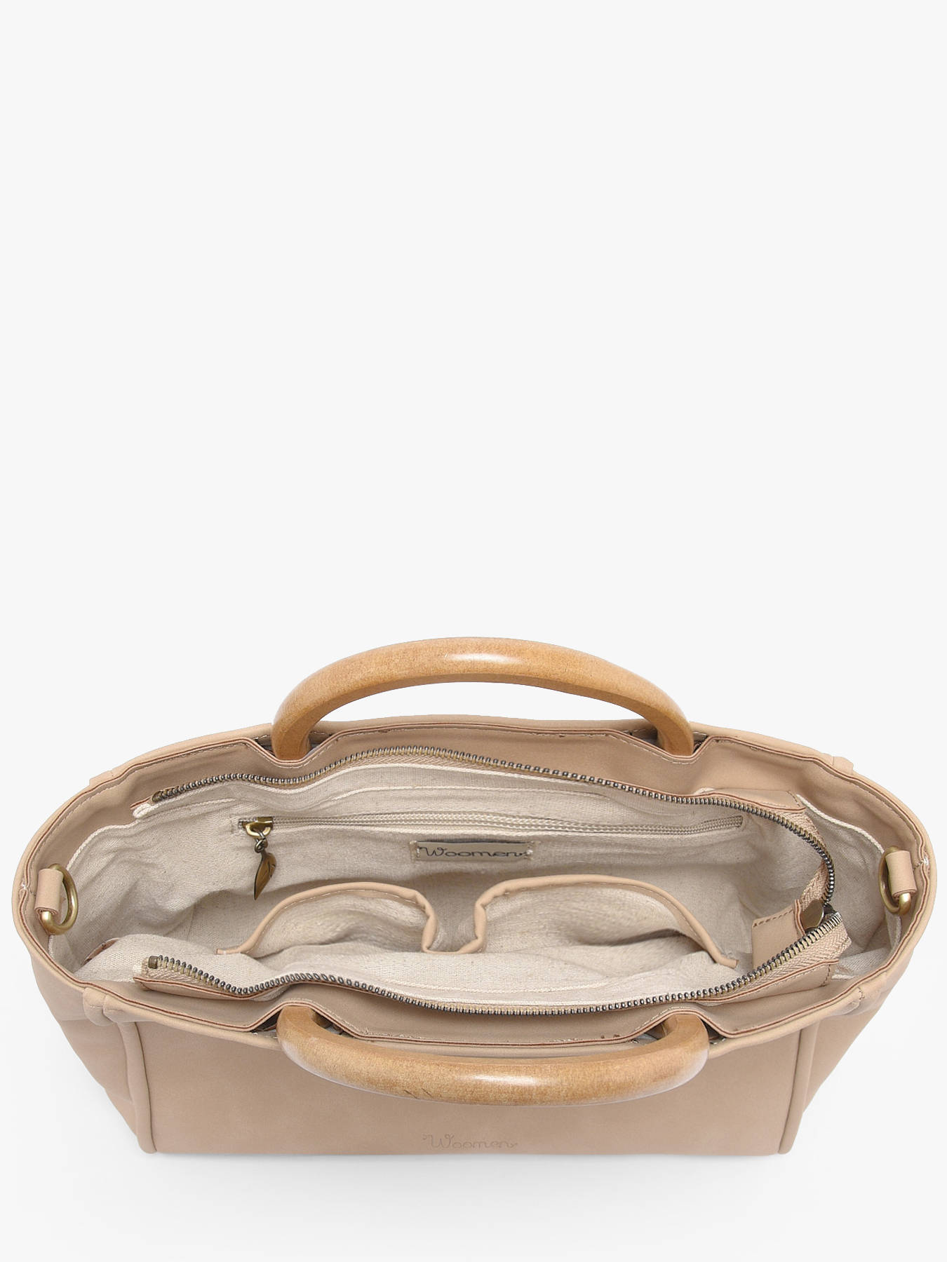 De WOOMEN handtas uit de CROCUS-lijn, gemaakt van gerecycled polyurethaan met een voering van katoen en linnen, wordt gesloten met een rits. De tas kan over de schouder of in de hand gedragen worden en heeft twee eenvoudige zakken, een ritszak en een enkel compartiment. De beige schouderriem met het Woomen-print en de houten ring als handvat geven een chique uitstraling.