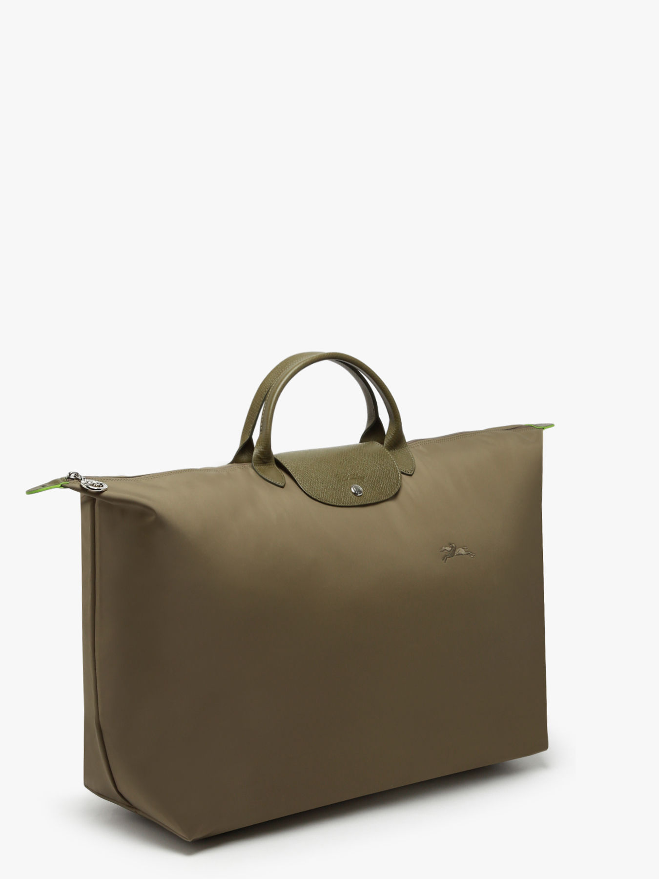 Deze ruimte reistas uit Longchamp's nieuwe Le Pliage Green-lijn is gemaakt van gerecycled polyamide canvas, zo draagt ook Longchamp haar steentje bij aan een betere wereld. Deze milieuvriendelijke tas is afgewerkt met het geborduurde Longchamp logo, en twee ton-sur-ton lederen handvatten. Het ultieme detail: een subtiel heldergroen randje. Niet alleen de huiskleur van het merk Longchamp, maar ook een knipoog naar Longchamp's inzet voor een betere, milieubewuste wereld. Energiek, fris en met respect voor de natuur!